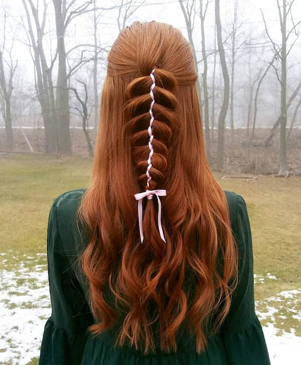 A five-strand ribbon braid with half-down waves is intricate and creative. White or colored ribbons add festive charm, making this hairstyle stand out for Christmas Eve parties.