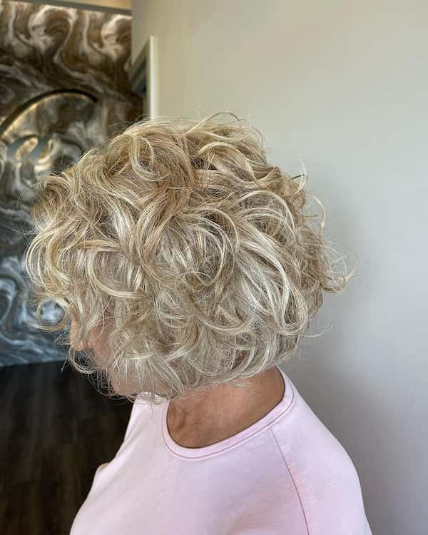 A graduated curly bob adds structure and sophistication. Shorter layers at the back gradually transition to longer curls at the front, creating a subtle cascading effect. This approach adds volume where needed and frames the face gracefully, making it one of the most flattering curly bob options for older women.