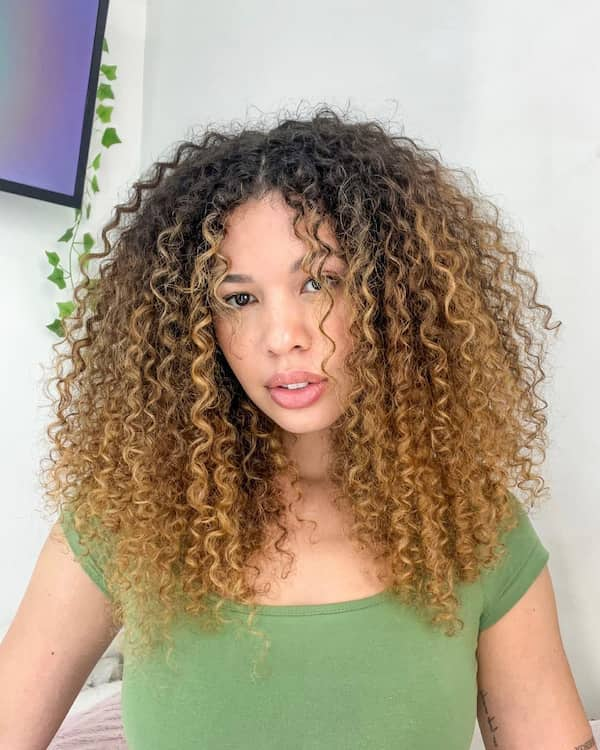 Brunette curls with subtle blonde highlights create depth and dimension. Pairing bangs with a center parting frames the face beautifully, making this style perfect for holiday gatherings where you want to stand out.