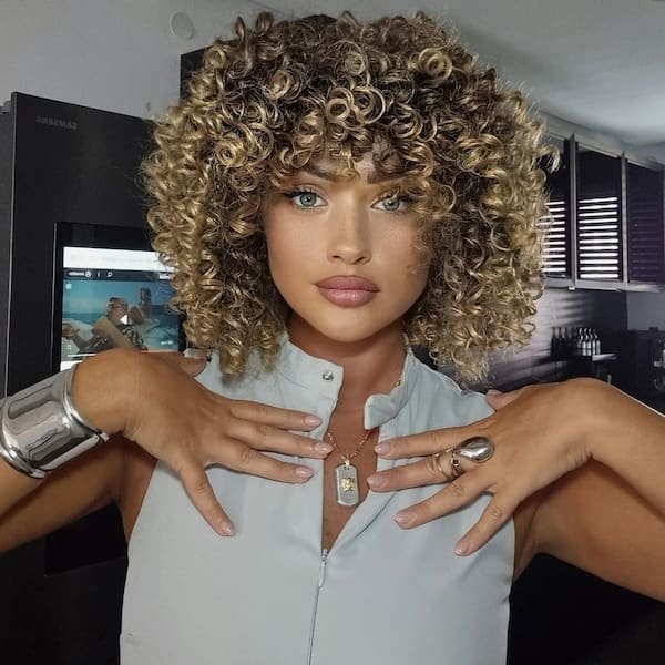 Short curly blonde hair with bangs offers a playful, youthful charm. Bangs blend seamlessly with curls, framing the face while adding texture and depth. This style is ideal for women wanting a chic, manageable holiday look.