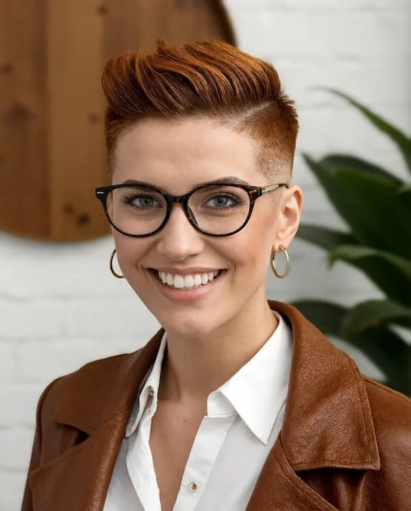 Short sides with longer layers brushed forward create a polished yet edgy pixie. Minimal product is needed—just a bit of styling cream or wax to hold the shape. The cut works well for both professional and casual settings.