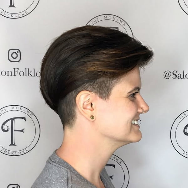 Chic and edgy, this undercut pixie is all about polished attitude. The brown shade adds maturity, but you can experiment with vivid colors for a unique twist. The undercut keeps the style light and low-maintenance while letting the textured top shine.