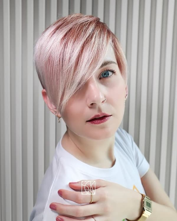 Candy-pink highlights and long, side-swept bangs create a fun yet daring pixie cut. The long fringe softens facial features, while the pink tones inject playfulness. Pair this haircut with bold makeup or statement accessories for a dramatic, attention-grabbing effect. Light styling with a volumizing mousse or wax ensures the cut maintains its shape while keeping the look vibrant and youthful.