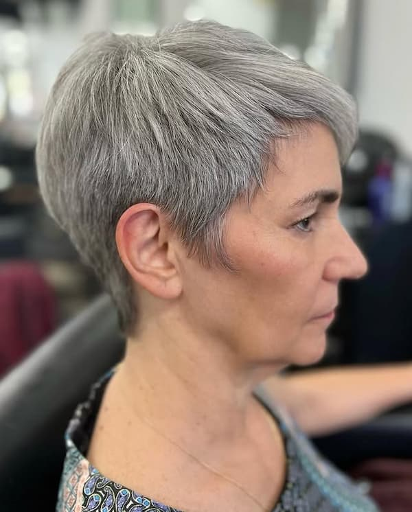 A gray edgy pixie proves that style has no age limits. This haircut celebrates natural gray hair while maintaining a youthful, bold edge. Layers add texture, and minimal styling ensures volume and definition without overcomplicating maintenance. It’s ideal for older women who want a chic, low-maintenance pixie that feels modern and sophisticated.