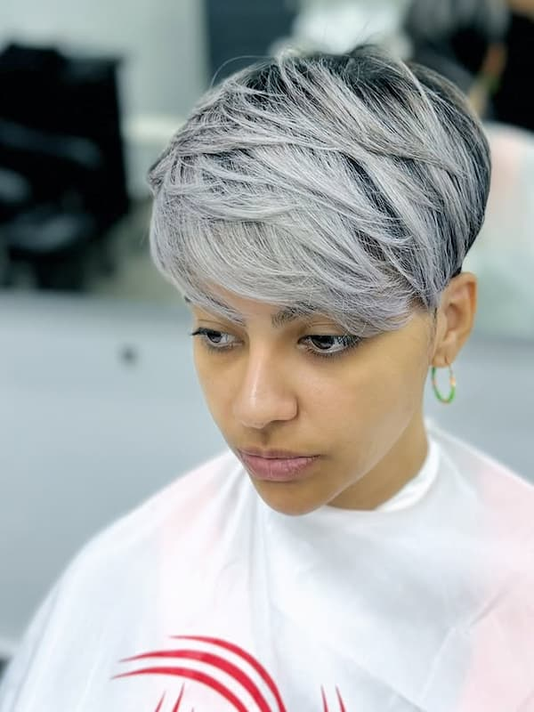 Side-swept bangs grazing the cheekbone add mystery and edge to this layered pixie. The cut is versatile, suitable for workdays, nights out, or creative settings. Layers provide texture and dimension, while side bangs frame the face, giving a chic, effortless finish.