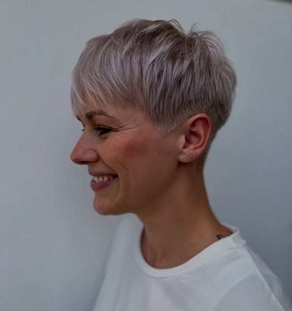 This pixie cut features a clean V-shaped nape, perfect for fine-haired women seeking added structure and volume. The sharp nape adds sophistication, while the top layers provide lift and dimension. Styling options include slicking the hair back for a polished look or spiking it for casual charm. This cut is versatile and elegant, suitable for both professional and playful settings.