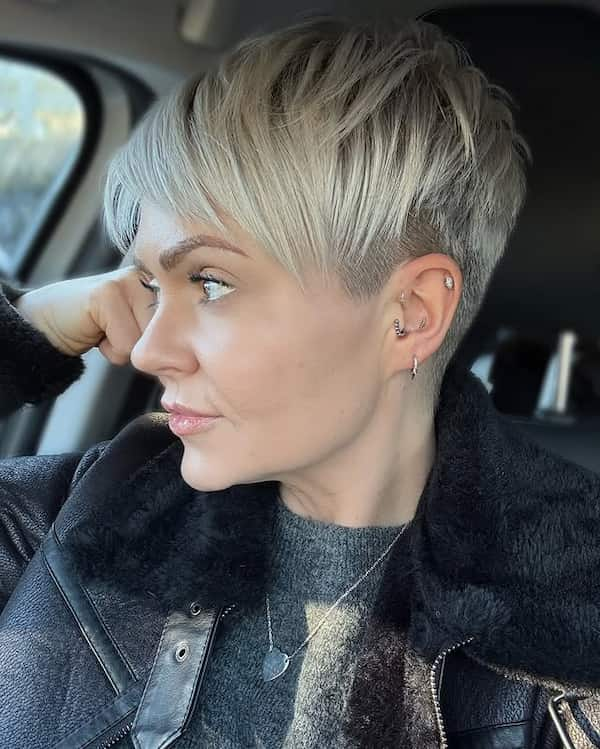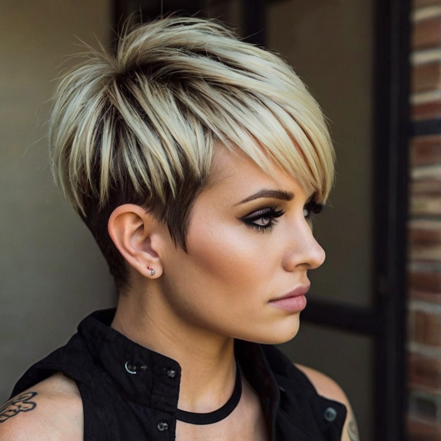 The punk edgy pixie with shaved sides is unapologetically bold. It’s designed for women who want to make a statement with minimal styling effort. The shaved sides create dramatic contrast, while the top layers remain textured and voluminous. This style works beautifully with edgy accessories, smoky makeup, or casual streetwear, making it perfect for fashion-forward individuals who embrace their rebellious side.