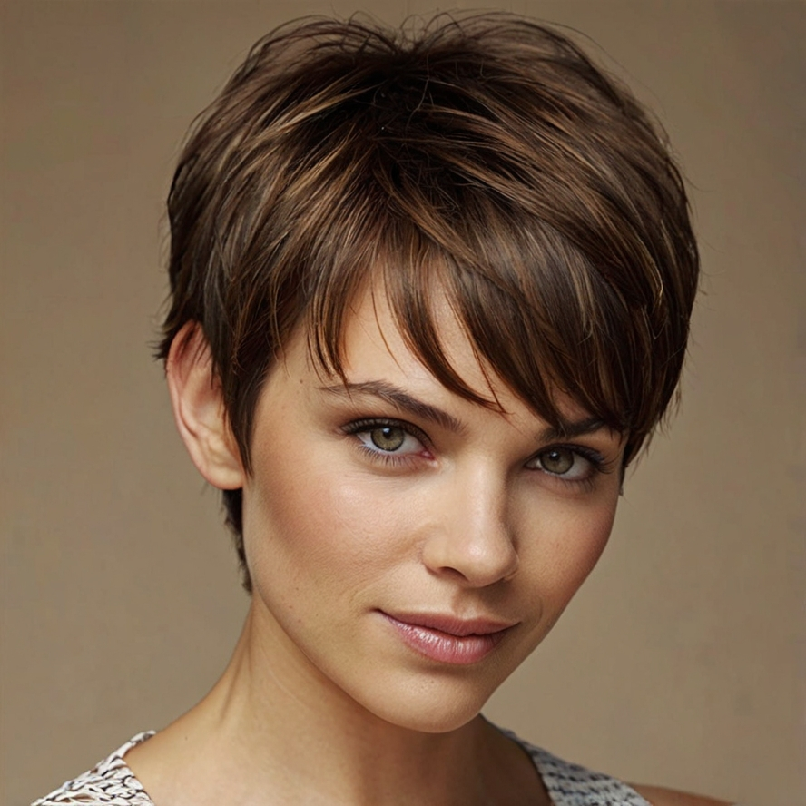 Warm brown tones paired with layered pixie cuts help maintain softness and femininity. Layers add volume for fine hair without weighing it down. This cut is ideal for women who want a lightweight, polished look that enhances natural texture while keeping hair manageable.