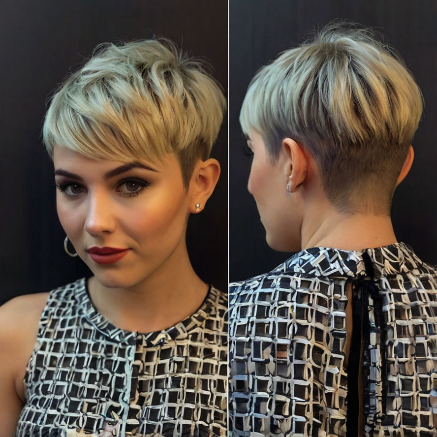 The layered undercut pixie blends edginess with elegance. The undercut keeps the sides neat, while layered strands on top add volume and dimension. This cut is ideal for women looking for a modern style that remains versatile and easy to manage. Styling can range from sleek and polished to textured and tousled, depending on the mood. A lightweight texturizing spray or mousse enhances lift and movement, ensuring the haircut stays dynamic throughout the day.