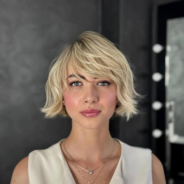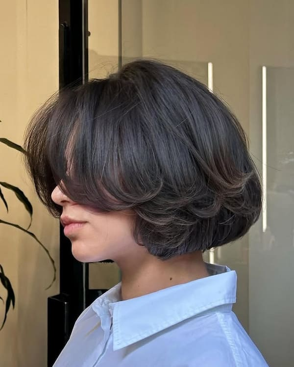 The flirty feathered bob with bangs combines charm and playfulness, making it perfect for women with finer hair textures. The feathered layers provide volume and texture, while the bangs frame the face delicately, enhancing facial features. This style is particularly flattering for younger women or anyone looking to infuse their hairstyle with a fun, youthful energy.