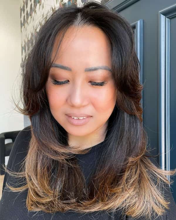 This medium-length butterfly cut with feathered curtain bangs demonstrates that you don’t need full feathering to achieve a striking look. The delicate feathering at the bangs frames the face, adding subtle charm. It’s perfect for women who want a playful, airy style without too much volume or maintenance.