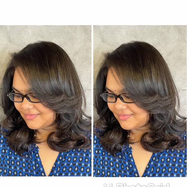 Bouncy layers with a fringe bring energy and movement to medium-length hair. The feathering ensures a lightweight, airy effect, while the fringe adds playful charm. This style is ideal for women who want a fun, dynamic haircut that’s versatile and easy to style.