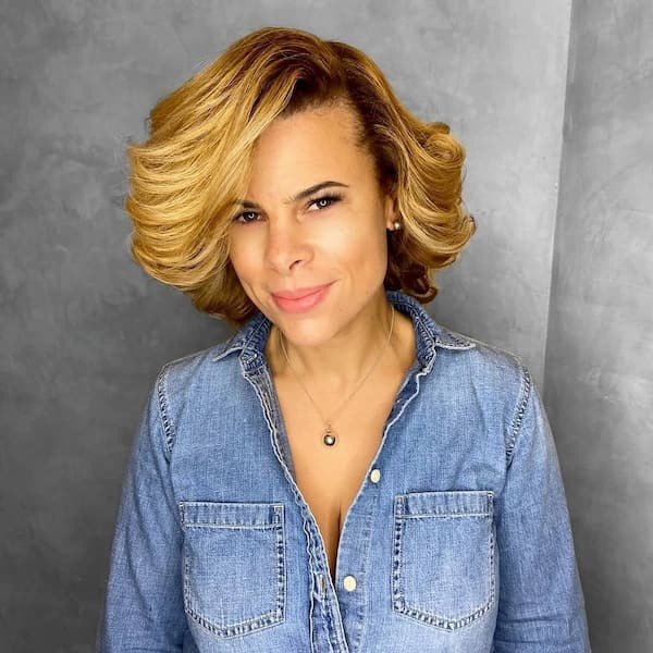 Blonde feathered bobs are both stylish and practical, especially for busy moms. The feathered layers lighten the hair, making it more manageable while maintaining a polished, fashionable appearance. It’s a versatile style suitable for everyday wear or special occasions.