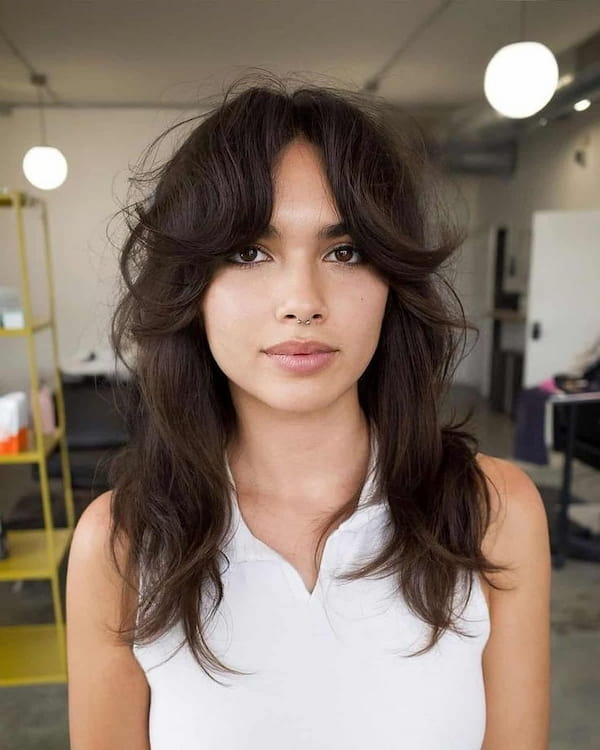 A mid-length shag with feathered curtain bangs delivers texture, volume, and effortless cool. The layers enhance movement while the bangs add softness, making this style perfect for women who want an edgy yet approachable look.