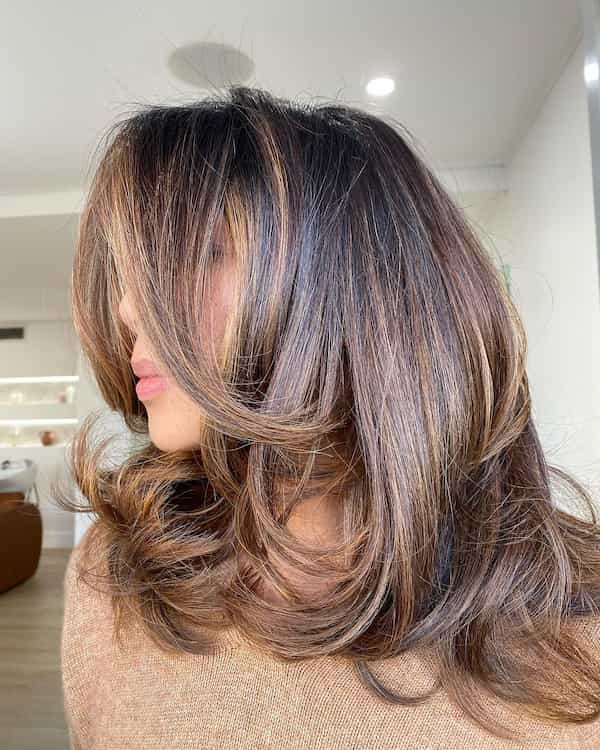 A bouncy blow-dried feathered cut creates volume and shine, especially with dimensional warm tones. The layers and bangs add texture and frame the face beautifully, resulting in a polished, playful medium-length hairstyle.