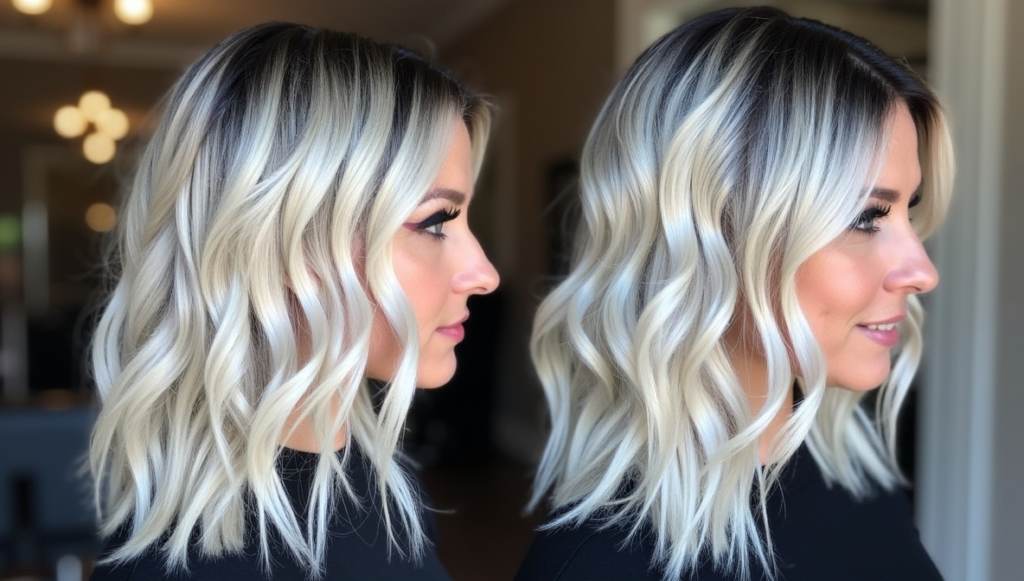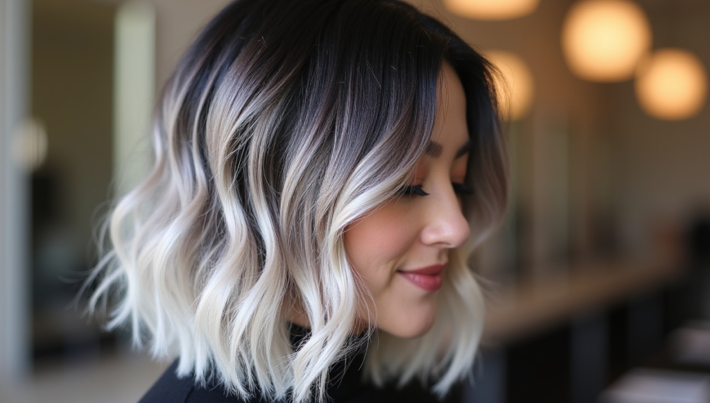 Turn heads with high-contrast platinum waves over a black base. This dramatic transformation amplifies brightness and offers a bold, bombshell-inspired aesthetic. The platinum sections catch light beautifully, providing dynamic movement throughout the hair. Using professional platinum dyes and deep conditioning masks ensures hair health and shine. Ideal for individuals willing to make a daring statement, this hairstyle balances edgy drama with glamour, creating a modern, fashion-forward look suitable for both special occasions and high-impact everyday style.