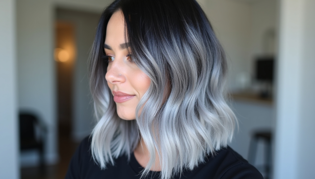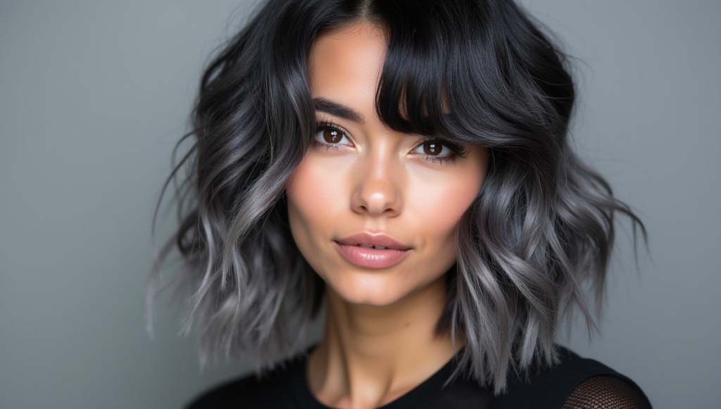 Achieve a modern, edgy look with smoky gray strands blending seamlessly with black hair. The metallic undertones create a cool, contemporary finish, while loose curls add depth and movement for effortless sophistication. This understated yet striking style works well for those who want a bold color without overpowering the overall look. Professional gray dyes preserve shine and vibrancy, ensuring the hair maintains its sleek, fashionable appearance. Ideal for anyone seeking a chic, low-maintenance statement.