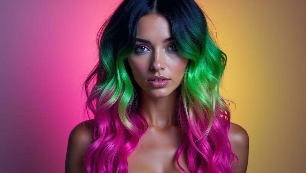 Bring festival-ready energy with a neon dip-dye blending electric green and purple on jet-black hair. Colors start mid-length and intensify toward the tips for maximum impact. This bold, playful look works beautifully with voluminous waves, enhancing texture and dimension. Using professional neon dyes ensures the colors remain vibrant and striking, while protective treatments maintain hair integrity. Ideal for fearless personalities, this style delivers high-contrast, head-turning results, balancing edgy aesthetics with a fun, expressive flair.