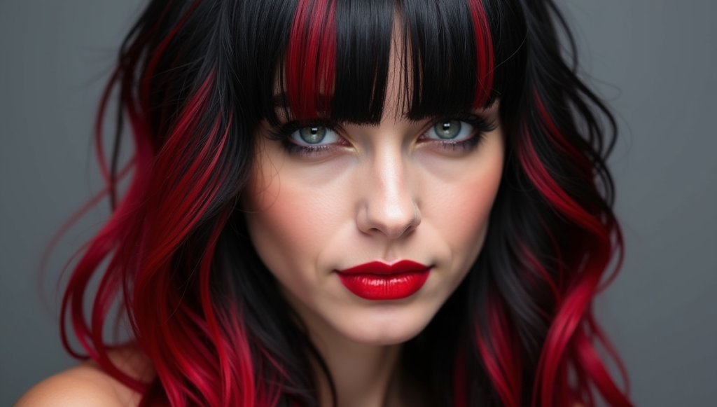 Add bold red streaks to sleek black hair for a structured, high-impact look. The crimson lines create movement and contrast, especially when paired with straight styling or blunt bangs. This gothic-inspired aesthetic is perfect for those who love precision and drama. Using professional red dyes ensures even saturation and vibrant longevity. Layered cuts and shine-enhancing products amplify the depth of the red against black, producing a polished, editorial-ready hairstyle with edgy sophistication.