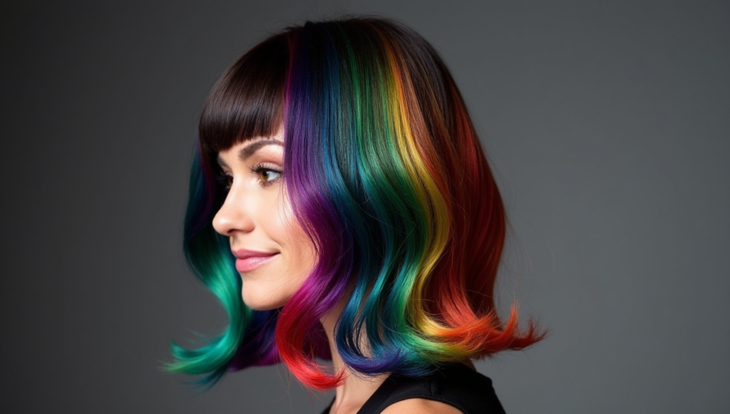 Introduce hidden pops of color with rainbow streaks beneath a sleek black top layer. Hints of green, blue, orange, and purple peek through as hair moves, adding playful vibrancy without a full commitment. This subtle yet exciting design enhances texture and dimension. Using professional rainbow dyes ensures longevity and color clarity. Perfect for those who want a creative, low-maintenance statement, this style combines bold artistry with wearable, everyday elegance, giving hair an element of surprise and dynamic personality.