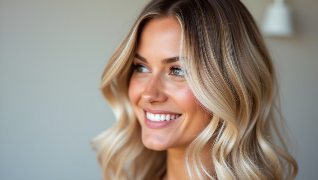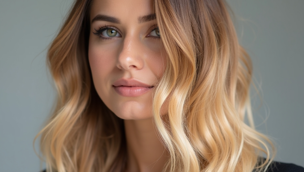 Achieve sun-kissed, breezy vibes with sandy blonde balayage over black roots. The blend of warm honey and cool blonde tones creates a natural, luminous gradient. Soft waves enhance movement and texture, adding beachy charm. Professional balayage dyes ensure seamless blending and color longevity. Perfect for those transitioning to lighter shades, this hairstyle provides a bright, effortless finish while maintaining elegance and wearability for daily life, special occasions, or casual, sunlit styling.