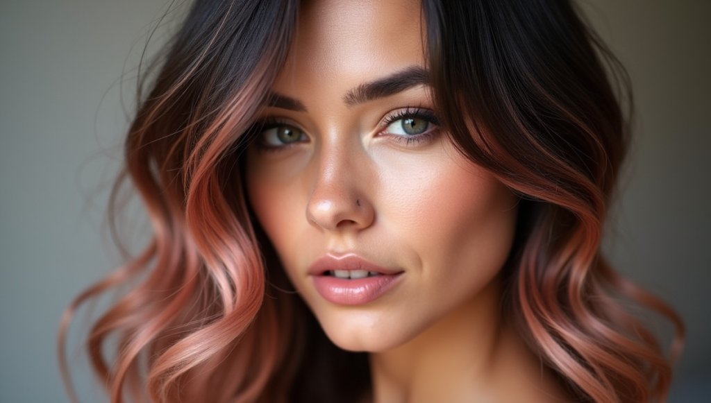 Add romantic sophistication with rose-gold highlights layered over black hair. The soft pink shimmer creates a luminous, warm glow, enhancing pale or neutral skin tones. Subtle waves or straightened styles reflect light, showcasing the multi-dimensional effect. Using professional rose-gold dyes ensures seamless blending and color retention. Ideal for anyone wanting a refined yet trendy hairstyle, this look merges luxury with creativity, offering a polished, feminine aesthetic that remains wearable for daily life or special occasions.