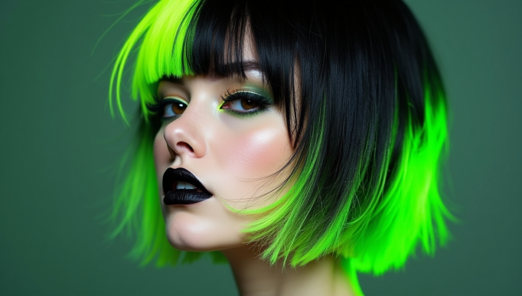 Make a statement with a split-dye hairstyle combining jet black and neon green halves. The vivid contrast draws attention and creates a striking, playful aesthetic. Adding touches of highlighter yellow on the fringe amplifies vibrancy and adds a creative twist. Professional neon dyes maintain brightness and saturation while preserving hair health. This punk-inspired look is ideal for bold personalities who enjoy eccentric, high-impact styles, delivering both edgy flair and modern, wearable artistry.