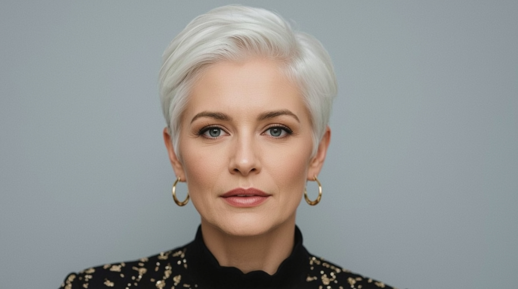 A white hair short haircut provides a high-class, stylish option for women over 40 who want a bold yet elegant look. While seasonal changes may affect manageability, this haircut shines with proper care and attention.