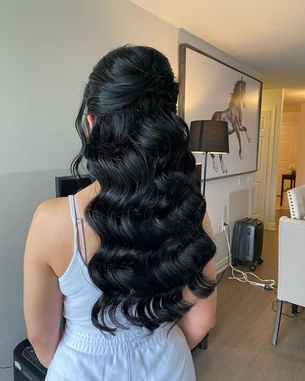 A classic wavy half up half down hairstyle emphasizes soft, flowing waves that are timeless and elegant. Black hair with natural waves adds richness, while blonde or lighter tones highlight the hair’s texture. This style works for weddings, parties, or any occasion where you want a polished, effortless look. Its simplicity makes it approachable yet sophisticated, suitable for a variety of hair lengths.