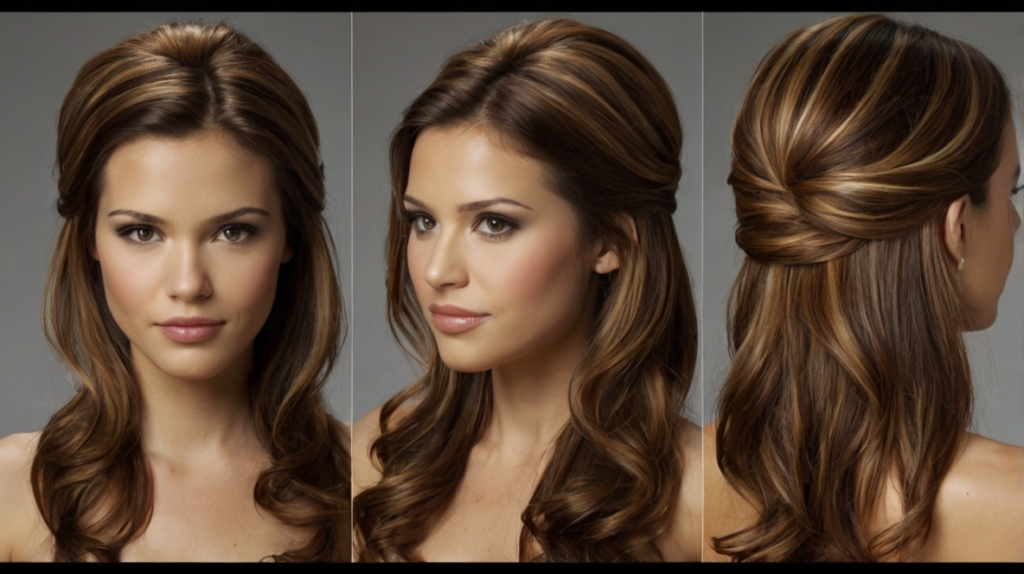 Brown tones combined with soft waves create a charming half up half down hairstyle for medium-length hair. A braid or twist adds flair while maintaining simplicity. This style is versatile, suitable for weddings, parties, or casual events where elegance is desired.
