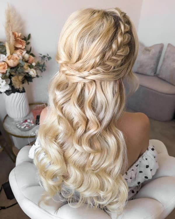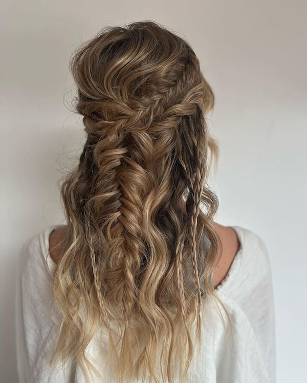 Side braids in a half down hairstyle add a bohemian twist, creating a chic, relaxed appearance. Waves and flowing locks enhance the texture, making it ideal for weddings or outdoor events. This style highlights the hair’s natural movement while maintaining a polished finish.