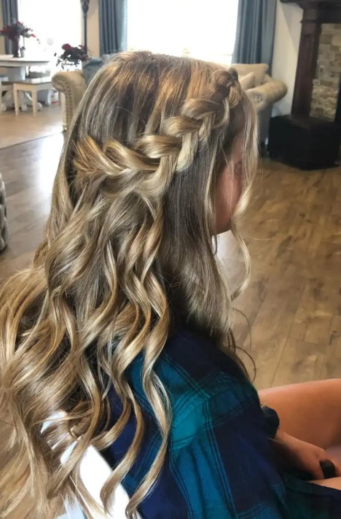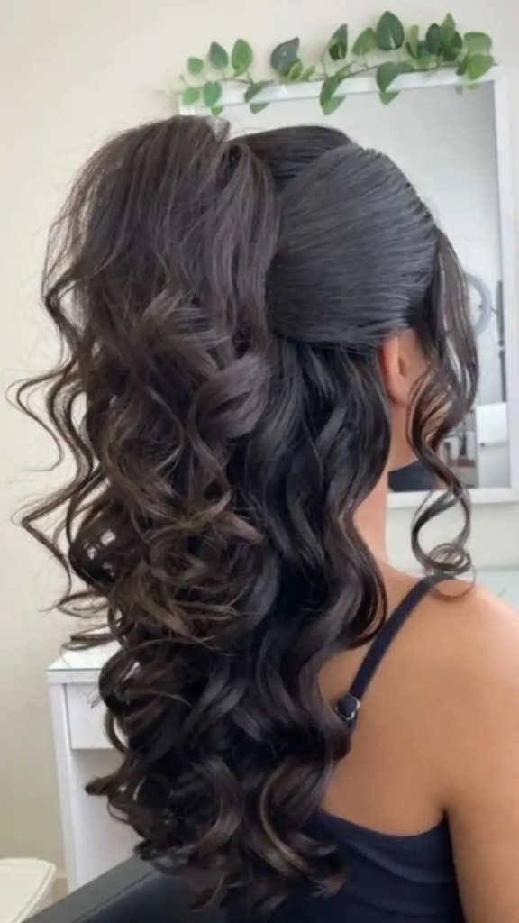 The half-up ponytail with curls offers the best of both worlds. The top portion of the hair is pulled back into a small ponytail while the bottom half remains curled and flowing. This design keeps the face clear and bright while allowing length and texture to shine. The curls add bounce and dimension, preventing the style from looking flat. You can accessorize with decorative pins or a subtle ribbon for added personality. It’s a balanced hairstyle that feels youthful, romantic, and perfectly suited for homecoming celebrations.