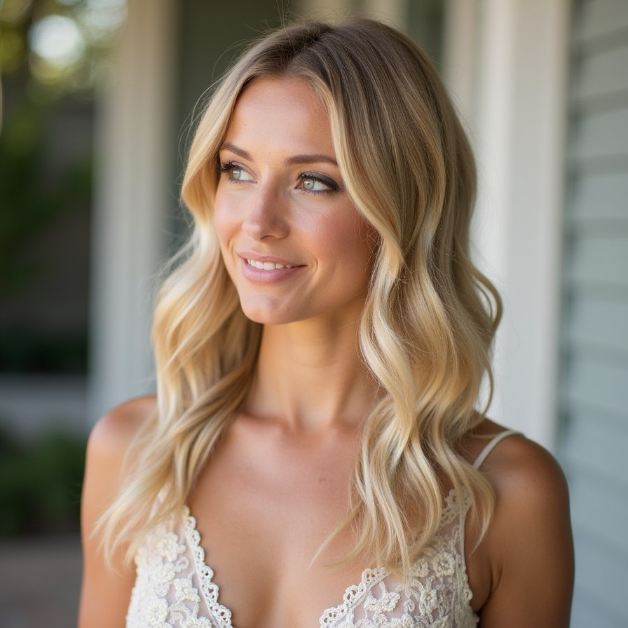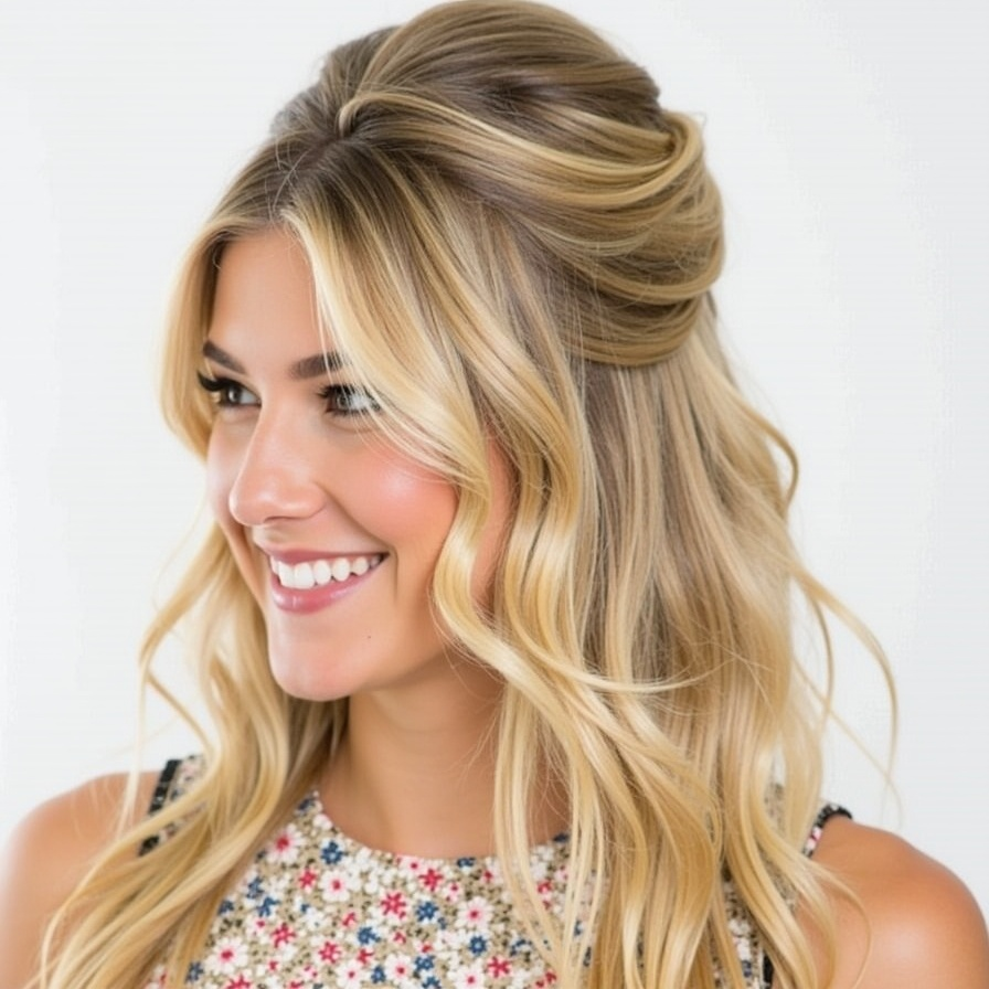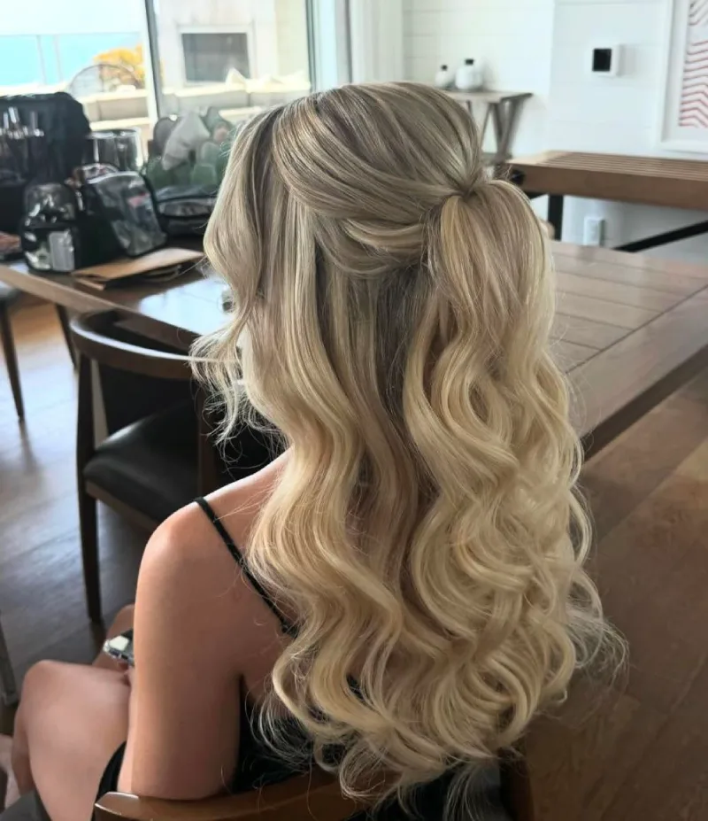 Romantic half-up blonde waves combine luminous color with soft styling. The top section is gently gathered and secured, while the rest of the hair flows in loose, radiant waves. Blonde tones reflect light beautifully, enhancing depth and dimension. The waves are soft and touchable, creating a feminine and graceful finish. This hairstyle highlights natural brightness while maintaining elegance. It works especially well in evening lighting, where the color and movement truly stand out. The overall effect feels dreamy, polished, and ideal for homecoming night.