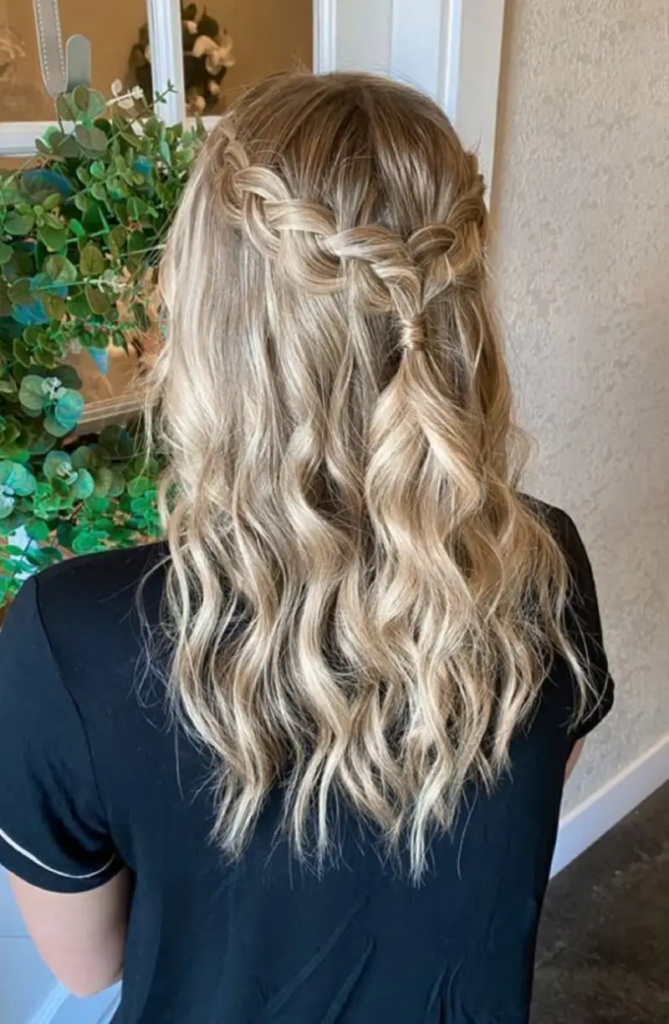 Half-up loose beach waves blend casual texture with structured detail. The top portion of the hair is pulled back and secured, while the rest falls in soft, relaxed waves. These waves appear natural and slightly tousled rather than tightly curled. The style creates a fresh, effortless look while still feeling polished enough for an event. It offers movement without heaviness and suits a variety of dress styles. This hairstyle is ideal for anyone wanting a balance between laid-back charm and subtle sophistication on homecoming night.
