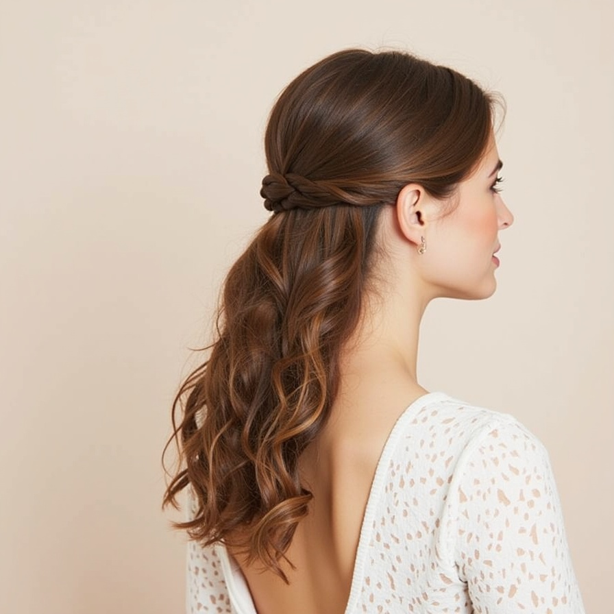 The twisted half-up with curls adds subtle detail to a romantic base. Instead of using a simple ponytail, sections from each side are twisted and pinned together at the back. The remaining hair falls in soft curls, creating harmony between structure and movement. The twists add texture and visual interest without overwhelming the look. This style feels thoughtfully designed yet easy to wear. It keeps hair off the face while still maintaining fullness and length, making it a charming and practical choice.