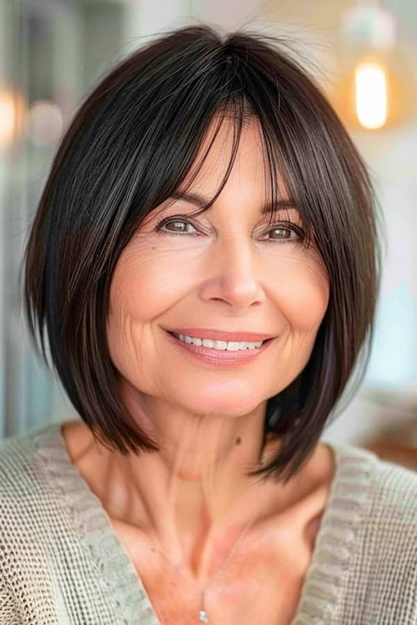 For women over 50 who want a playful yet elegant style, a textured bob with bangs is ideal. Layers throughout the hair add volume and movement, while bangs draw attention to the eyes and face. This haircut is easy to maintain and can be styled sleek or tousled, depending on the occasion. It works beautifully on fine hair, creating the illusion of fullness and preventing the hair from appearing flat. A light texturizing spray or mousse can help maintain the lively layers for an effortless finish.