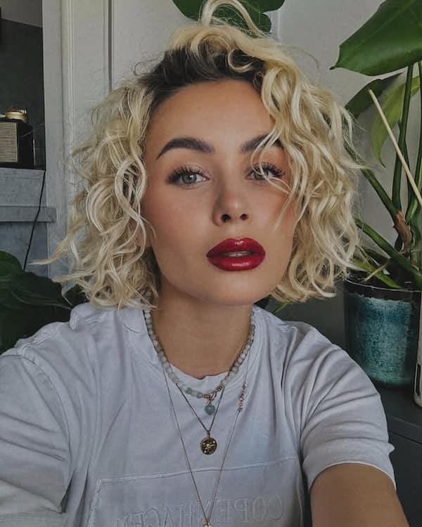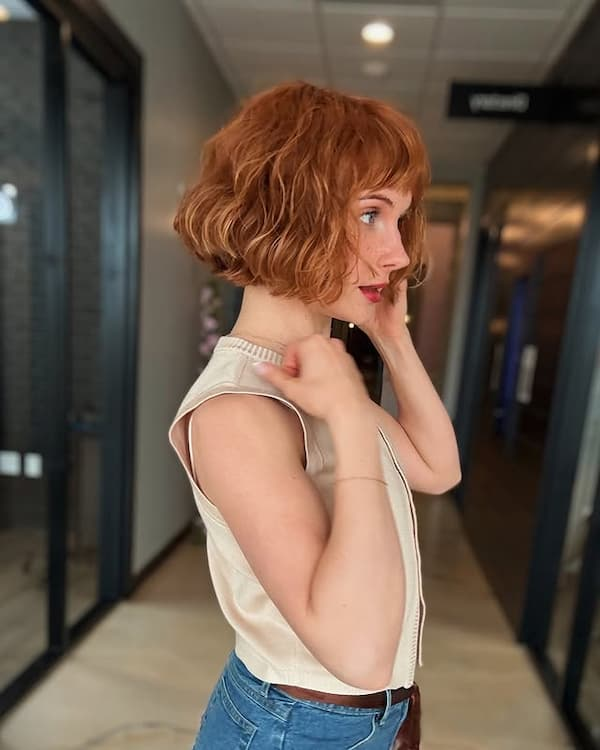 Blonde curls paired with a romantic bob create a soft, dreamy aesthetic that feels light and feminine. Delicate curls and warm, soft blonde tones enhance a sense of charm and elegance, making this haircut ideal for women who want to add a romantic touch to their everyday look. Styling involves light curl-enhancing products and minimal heat to maintain softness and shine. Accessorizing with subtle jewelry or makeup, like rosy cheeks or soft lip tones, complements the gentle allure of this romantic style.