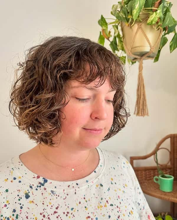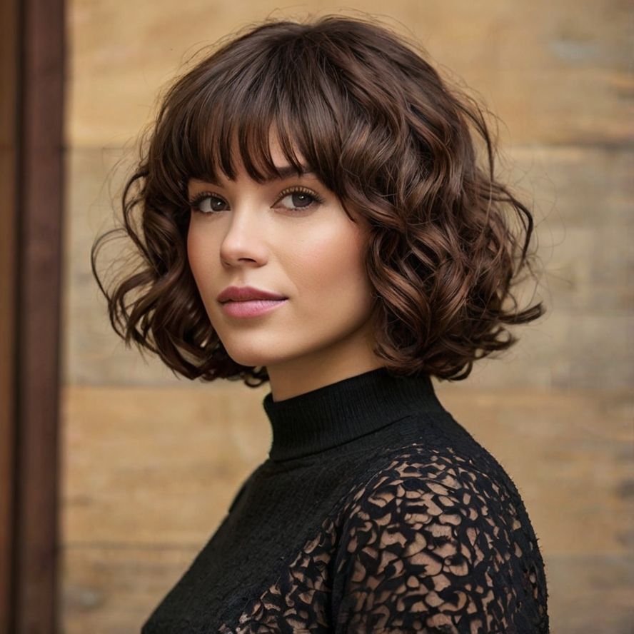 Brown Curly Bob with Bangs