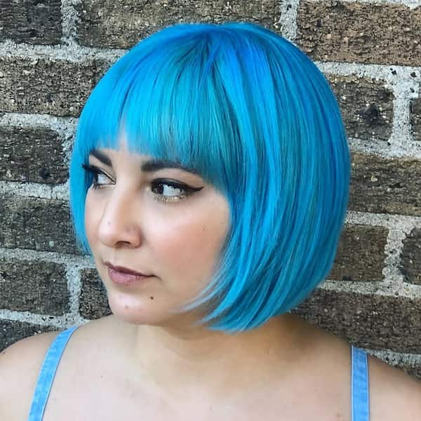 A blue layered bob with blunt bangs is bold and striking. The vivid color enhances the layered structure, making the bob pop, while blunt bangs add definition and draw attention to the eyes.