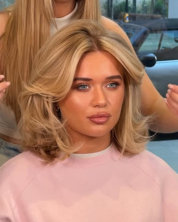 Use volumizing mousse before blow-drying to achieve soft, bouncy ends. The cut works well straight or with gentle waves, offering a versatile, flattering hairstyle for everyday wear or special occasions.