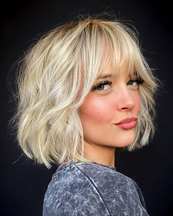 For those seeking a playful, edgy look, the blonde shaggy bob with choppy bangs is ideal. The choppy layers provide texture and movement, while the bangs add character and a touch of boldness.