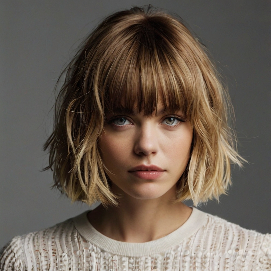 Feathered layers with choppy bangs elevate a regular bob into a playful, textured style. The layers create dimension, while the bangs add movement and visual interest.