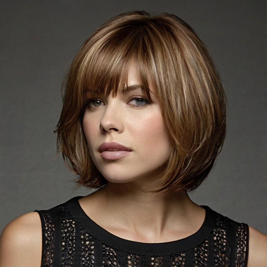 Whether worn sleek and polished or tousled for a relaxed, casual look, the layered bob with bangs can suit a variety of hair types and face shapes. Subtle highlights or balayage can further enhance the layers, giving depth and dimension to the hairstyle.