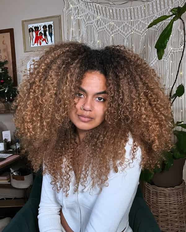 Blonde curls with darker roots offer a low-maintenance style that grows out gracefully. The shadowed roots provide depth, dimension, and natural movement. Perfect for highlighting texture while minimizing frequent touch-ups, this look keeps curls vibrant and visually interesting. A lightweight leave-in conditioner helps retain moisture and shine without weighing curls down.