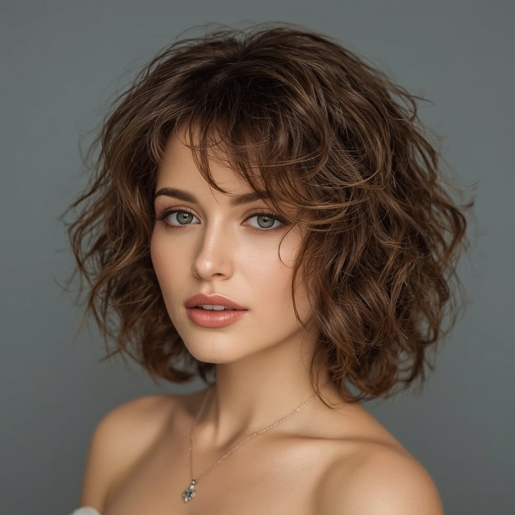 A mid-length brown curly cut with wispy bangs frames the face elegantly. The rich brown hue adds warmth, while soft bangs keep the look approachable and playful. Gold hoops or a subtle hair accessory complement this hairstyle beautifully. Use a lightweight curl cream and diffuse to maintain natural texture and shine throughout the day.