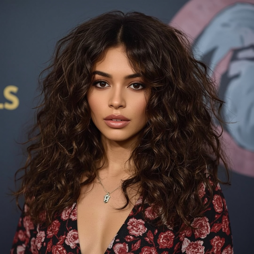 Long curls layered throughout keep volume balanced while maintaining a flowing, glamorous effect. Ideal for red carpet or special occasions, this cut works beautifully with soft waves created by a curling wand. A few drops of lightweight oil or serum enhance shine and reduce frizz without weighing curls down.