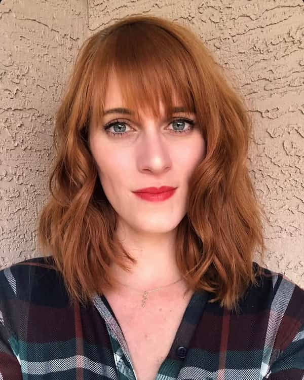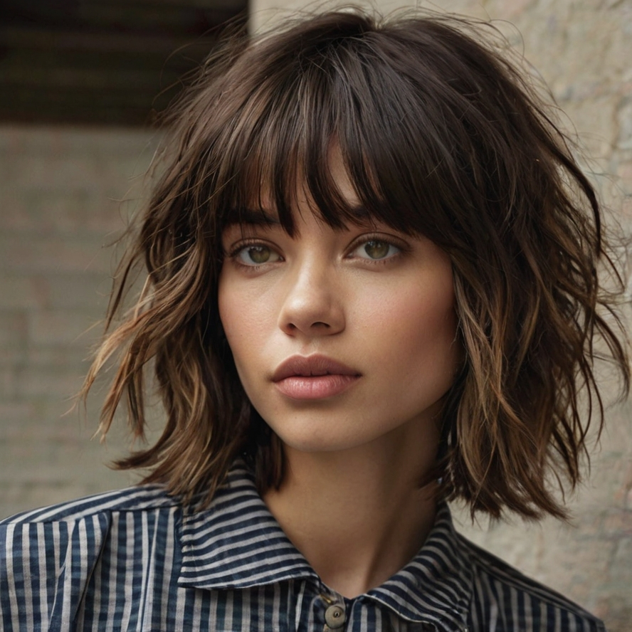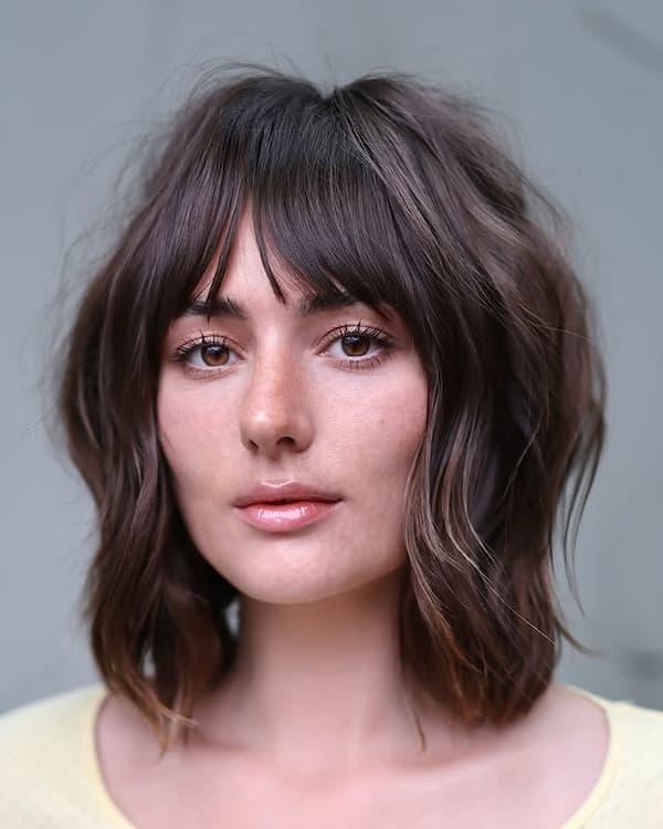 The shaggy wavy lob with layered bangs is playful yet structured, ideal for oval or long-face shapes. The wavy texture adds dimension and personality, while the layered bangs frame the face gracefully. Minimal styling with a curling wand or air-drying preserves natural waves. This haircut balances casual ease with chic appeal, making it suitable for both day-to-day wear and social events.
