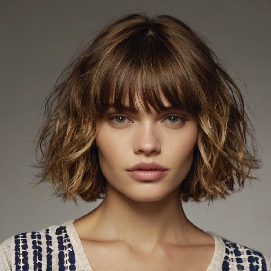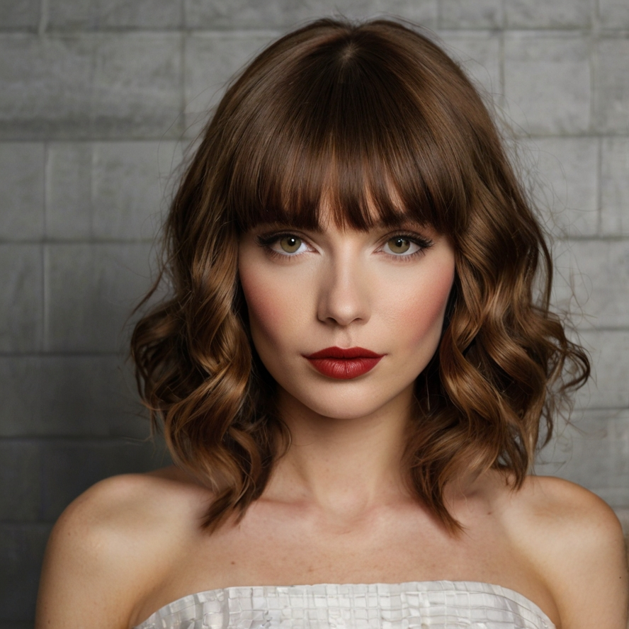 Inspired by glamorous events, this red carpet-ready wavy bob with blunt bangs makes a bold statement. Loose waves give texture, while the blunt bangs add definition and balance. Ideal for special occasions, this haircut pairs well with elegant outfits, statement jewelry, or evening makeup. Styling involves a curling wand or diffuser to create soft, controlled waves. This look embodies confidence, sophistication, and glamour.