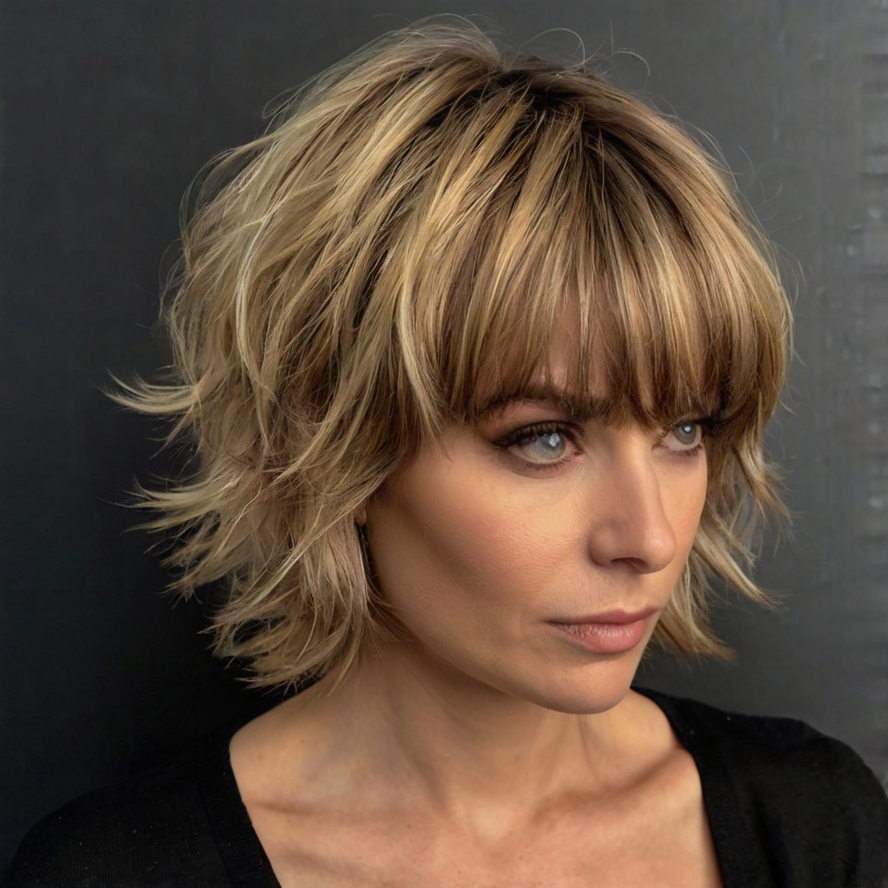 The wolfy lob with choppy bangs is edgy, stylish, and playful. It suits mature women who want a touch of rock-and-roll flair while keeping their hair feminine. Layers add movement, volume, and attitude, making it perfect for casual or evening events. Styling requires minimal effort with texturizing products to define choppy layers, allowing a carefree yet polished finish.