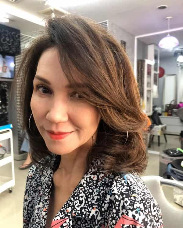 Layered brunette hairstyles remain timeless for women over 50. This cut provides the illusion of fullness, particularly beneficial for those with thinner hair. Symmetrically parted, the layers create natural volume while keeping the overall look balanced and elegant. Brunette shades add depth and dimension, enhancing shine and movement. This hairstyle is ideal for both formal and casual occasions, offering versatility while keeping hair manageable and refined.
